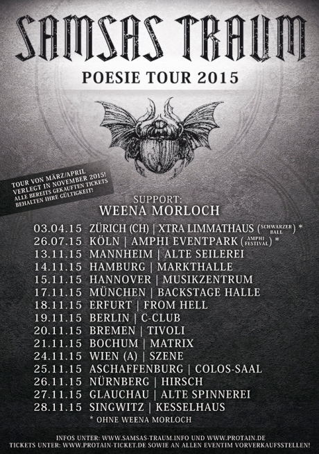 leider müssen wir Euch heute mitteilen, dass die geplante POESIE TOUR 2015 der Band SAMSAS TRAUM + special guest: WEENA MORLOCH von März/April in den November 2015 verlegt werden muss.