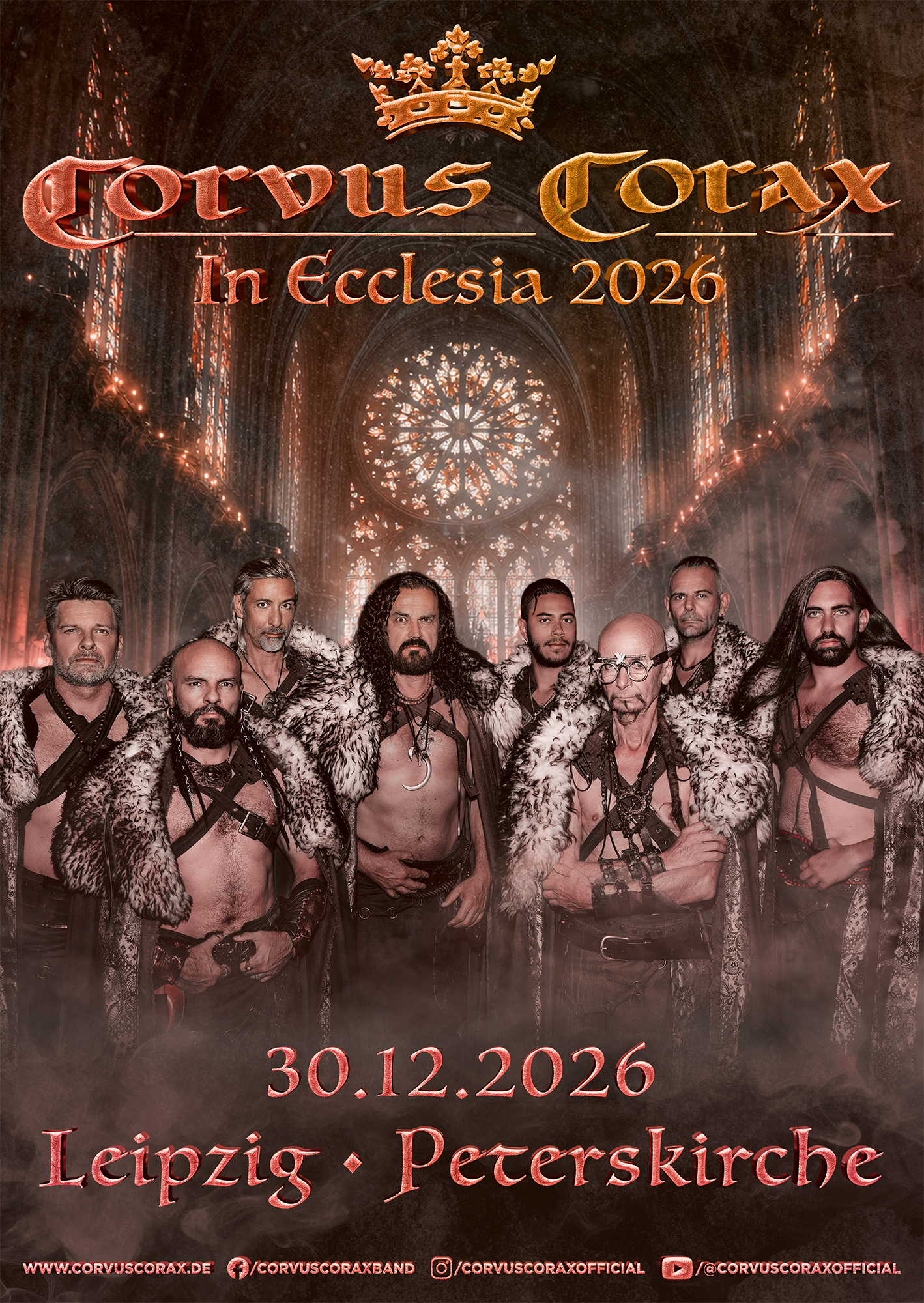 Corvus Corax auf Wintertournee 2026 – „IN ECCLESIA“ Feierliche Klänge zur Weihnachtszeit Corvus Corax gehen auch in diesem Jahr auf Wintertour. Was 2024 als besondere Idee begann, hat sich inzwischen zu einer festen Einrichtung entwickelt: eine Konzertreise zur Weihnachtszeit, die gezielt besondere und stimmungsvolle Orte wählt. Die Wahl dieser Spielstätten ist kein Zufall. Corvus Corax musiziert mit aufwendig nachgebauten Instrumenten. Dudelsäcke, Schalmeien, Trommeln und Stimmen entfalten ihre Wirkung besonders in Räumen mit charakteristischer Akustik und prägender Architektur.