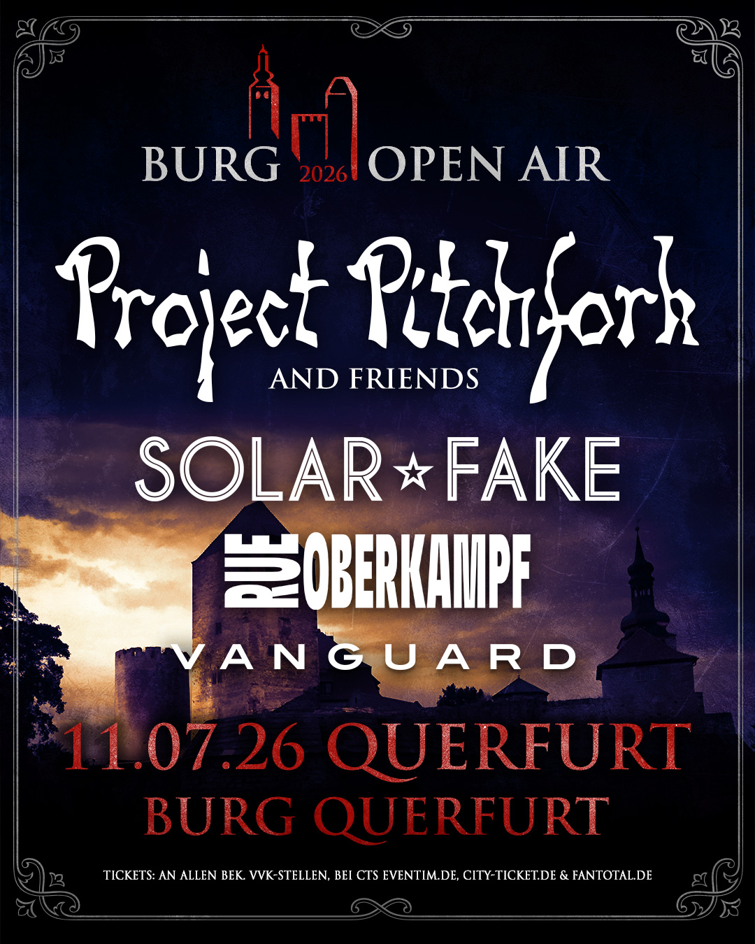 Unter dem Motto „Burg Open Air 2026 – Pitchfork and Friends“ erwartet Euch ein volles 90-minütiges Headliner-Set von Project Pitchfork – ein BEST OF aus dem gesamtem Schaffen der Band.. Doch damit nicht genug: Peter hat hochkarätige Freunde eingeladen, um diesen Abend zu einem unvergesslichen Festival zu machen. Mit dabei sind unter anderem Solar Fake, Rue Oberkampf sowie Vanguard. Gemeinsam präsentieren wir Euch ein exklusives Line-up und ein hochklassiges Programm, das unsere Szene begeistern wird.