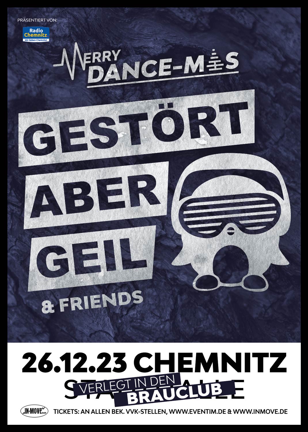 wie Ihr sicher schon erfahren habt, wurde die Show von Gestört aber GeiL am 26.12.2023 von der Stadthalle Chemnitz in den Brauclub Chemnitz verlegt (der Club liegt direkt im Areal neben der Stadthalle, ca. 150 m entfernt ). Dies hat einen ganz besonderen Grund: Wir haben uns in Abstimmung mit dem Künstler entschlossen, die Chemnitzer Clubszene zu unterstützen und Euch zu Weihnachten einen unvergesslichen Abend im Rahmen und Ambiente eines wirklichen Club & Dance-Events zu bescheren.